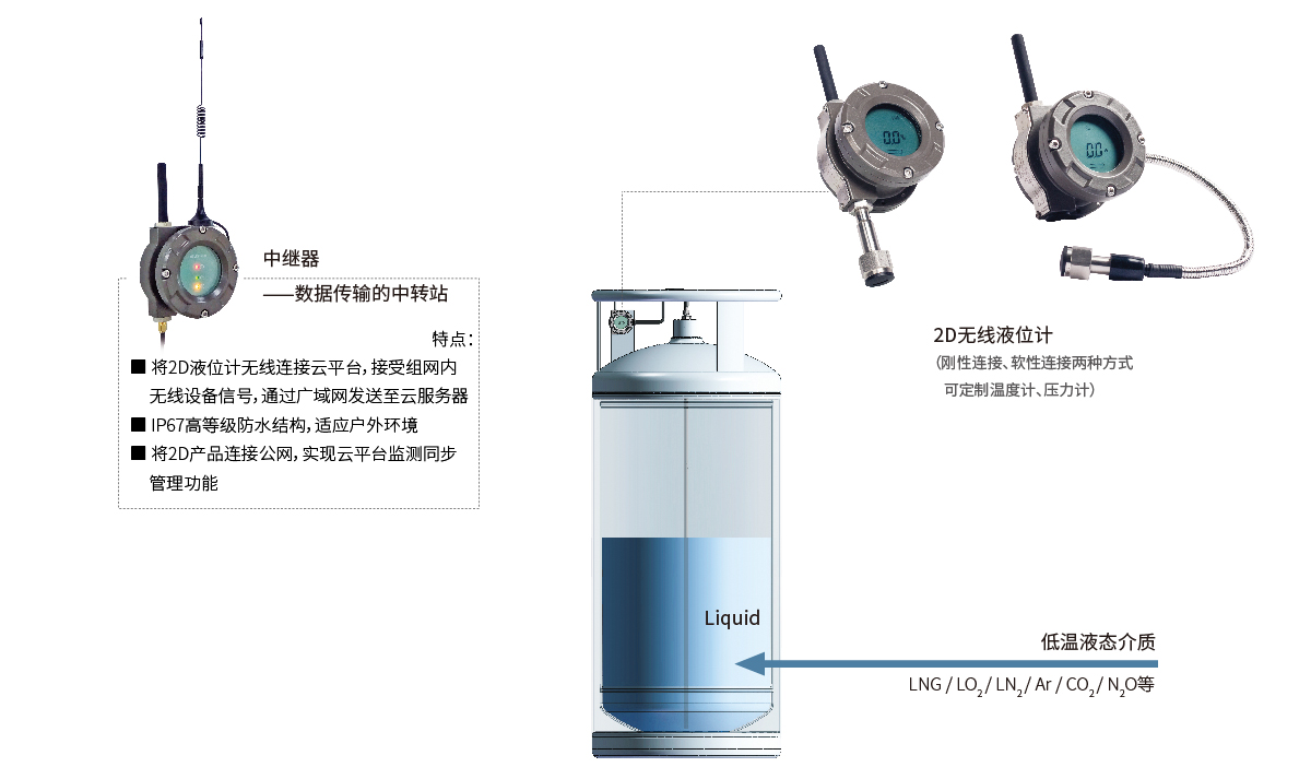 整套系統(tǒng)只通過一套數(shù)據(jù)中繼器及每個(gè)液氮罐杜瓦瓶上的無(wú)線液位計(jì)即可實(shí)現(xiàn)多終端的無(wú)線上網(wǎng),數(shù)據(jù)互聯(lián).